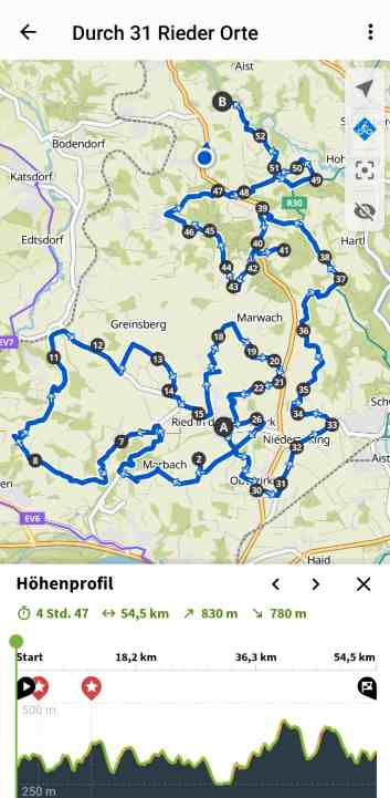 Unser erstes nach Ried Ort(1) zu bestaunendes Örtchen ist Wimm(2), weiter ging's entlang der Grenze zu Mauthausen nach Marbach(3). Das liebliche, in Privatbesitz befindende Schloss empfängt leider keine Besucher. Das kurvenreichen Strassel hinunter zur Kreuzmühle lädt ein um unsere Bremsen etwas weniger zu betätigen. Unten angekommen radeln wir vorbei am Bogenschießplatz entlang im idyllischen Tal des Riederbaches hinauf nach Anzendorf(4). Wir durchfahren das kleine Dorf nun Richtung Kollnerberg(5), Vorbei am Reha fit klettern wir in einem eindrucksvollen Hohlweg hinaus nach Frankenberg(6). Die dortigen Mauerreste des Frankenburger Kircherl gedenken der letzten Bauernkrieg Schlacht um 1636. Noch von der herrlichsten und wunderbarsten Fernsicht belohnt radeln wir weiter nach Blindendorf(7). 560 Einwohner tummeln sich im Dorf, viele davon sahen wir heute um ihre Häuser werkeln. Auf dem schmalen Weg durch das urige Wäldchen erreichen wir Lungitz und am Lungitzer Berg gelangen wir nach Weigersdorf(8). Noch eine kleine Dorfrunde, weiter geht's hinunter nach Danndorf(9), der alte eindrucksvolle Transformater begrüßt uns in Rieddorf(10). Franz hat Ried schon oft durchwandert und kennt jedes Wegerl, anders ergehts mir, diese Rieder Gegend kannte ich kaum und war ehrlich beeindruckt. Unsere Tour führt uns nun nach Grünau (11), unterhalb einem schönen Bauernhof birgt ein kleines Pumpenhäuschen den Rieder Trinkwasser Brunnen. Wir biegen ein zum Schlösschen Grünau, ein kurzer Blick durch das Schlosstor und danach weiter am schmalen Güterweg durch das kleine Schnellendorf(12). Im nu sind wir in Marwach(13), ein kleines Dorf vor Obenberg(14). Von hier radeln wir wieder Richtung Ried um nach Zeinersdorf (15) zu gelangen. Ferdi hat ja auch jedes Wegerl in Ried belaufen und wusste so manch Lustiges zu erzählen. Für uns geht's nun nach Waging (16). Vorbei an den mächtigen Bauernhöfen kommen wir nach Oberzirking(17). Wie so oft bildet auch hier die Straße die Gemeindegrenze.
